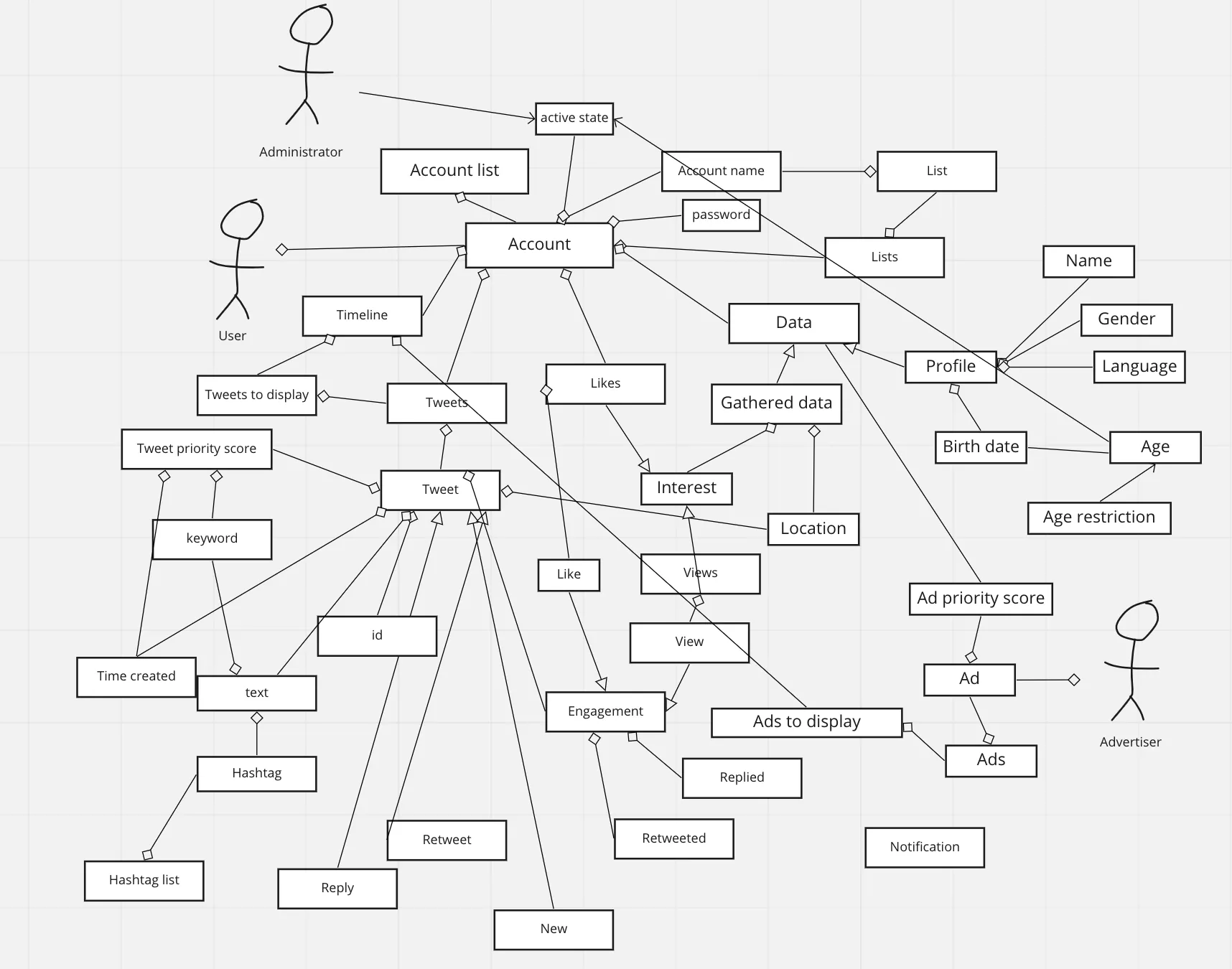 There are three major types of actors in Twitter: user (unregistered or registered), advertiser, and administrator. Thus I organized higher requirements of this system by the types of user.